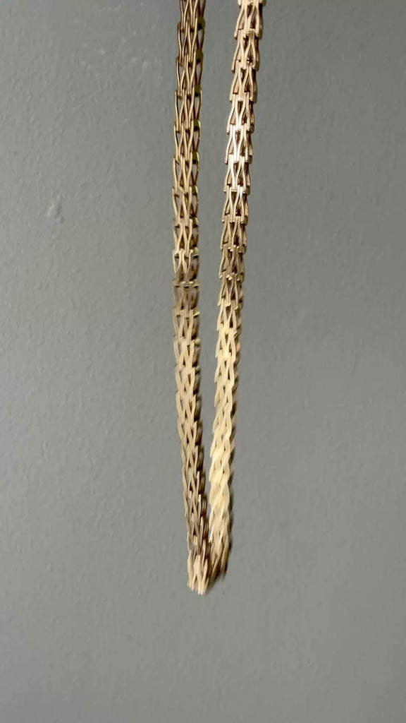 Necklace is made of 21.57 grams of solid 14k gold and measures 16.2 inches in length by 5.6 mm wide. She has a well working hidden box clasp with double safeties.