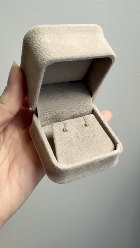 Tiny yet sturdy, 18 karat white gold stud diamond earrings. Italian stamps for gold purity.