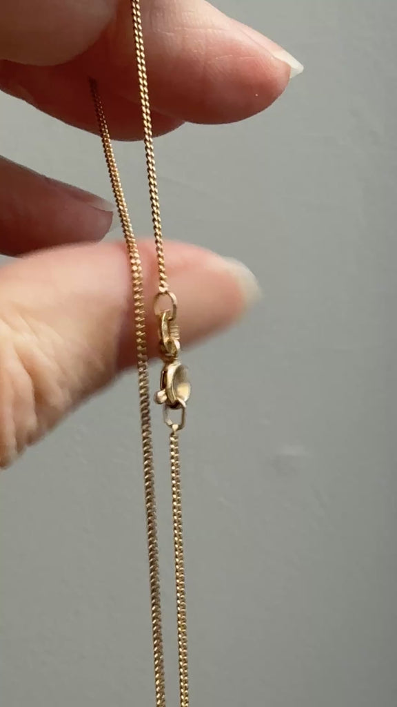 An excellent curb link necklace to wear solo or with a pendant. She is solid 18k yellow gold, weighing 1.9 grams and measuring 16.9 inches long by 1 mm wide.