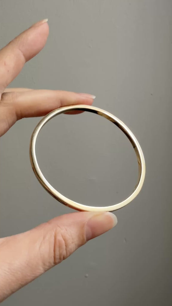 Vintage gold bangle is circular, with an interior circumference of approximately 7.6 inches and width of 3.5mm. Form is solid, not hollow, basically a bar of gold wrapped around your wrist:)