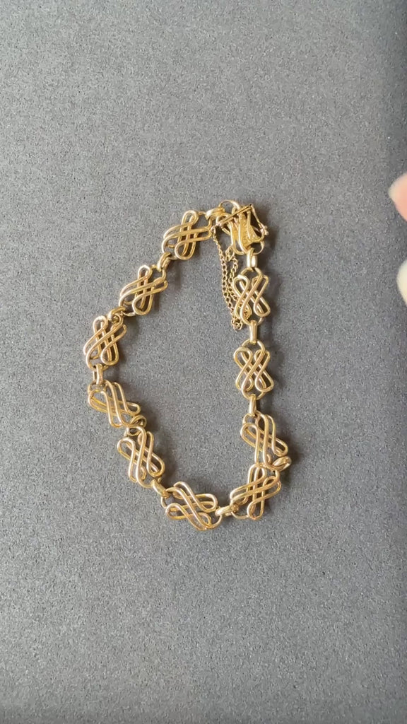 A fancy link bracelet (fancy being the official term for one of kind links) with swirled dimensional links like repeating cursive infinity loops. Link bracelet is handmade by Swedish maker GVH in 1946. The quality of the piece is just magnificent.